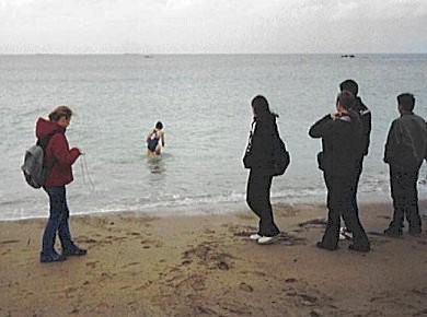 Das Wetter hat sich verschlechtert. Wir fahren nach dem Frühstück nach Cancale, bekannt für seine Austernzucht. Unterwegs halten wir an einem Strand an, um die in St.Brieuc vereinbarte Wette einzulösen. Die am schlechtesten abgeschnittene Mannschaft, d.h. Sabrina, Sebastian und Uli gehen im Meer baden. Sabrina findet soviel Gefallen daran, dass sie gar nicht mehr aus dem Wasser kommen will. Endlich verlässt sie das Wasser, es hat angefangen zu regnen. Unterwegs steigen wir zu einem kleinen Rundgang zur Pointe du Grouin aus. Von dort sehen wir in der Ferne den Mont St. Michel. In Cancale ist gerade Ebbe und wir sehen den mit Traktoren fahrenden Austernfischern bei der Arbeit zu. Das Wetter verschlechtert sich sehr und wir kehren zum Campingplatz zurück. Malte hat sich vorgenommen, für uns alle zu kochen. Es schmeckt vorzüglich. Abschließend bringen wir die Chalets in Ordnung und packen unsere Sachen.