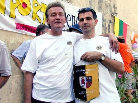 ![]() Hartmut Franken und Jannis Papadaniel, Vize- und Vorsitzender des BC Krefeld nach Empfang der Ehrung durch den Stadtsportbund. | |