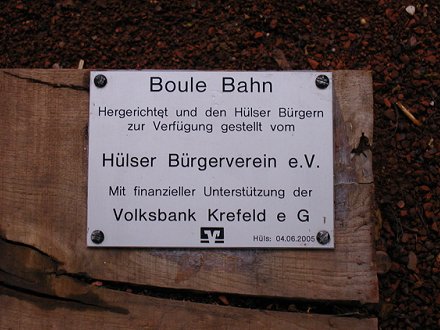 Am Samstag, den 04.06.2005 war der Präsident des BPV NRW eingeladen in dem Krefelder Ortsteil Hüls eine Boule Bahn ihrer Bestimmung zu übergeben. Trotz sehr regnerischen Wetters waren ca. 50 Gäste zu dieser Feierlichkeit erschienen. Nach einer ausgiebigen Einführung durch den Pressesprecher des Hülser Bürgervereines, begrüßte Berthold Perret, der Präsident des BPV NRW die Anwesenden erläuterte ein wenig die Geschichte des Boule Spieles und seine Regeln um dann anschließend die erste offizielle Partie auf dem neuen Bouleplatz mit geübtem Sauwurf zu eröffnen. Nach der Moderation der gesamten ersten Partie musste sich der Präsident leider verabschieden um rechtzeitig zum nächsten Termin zu gelangen.
