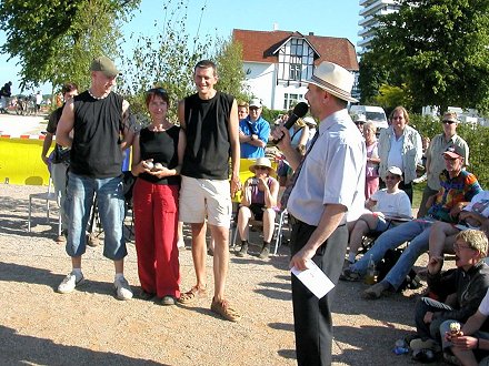 Ruth Seebach / Andreas Globig / Nicolaj Kirchhof (NRW) Deutscher Vizemeister Triplette sind Angelika Thelen / Thomas Thelen / Georgios Dimitriadis (NRW) Den 3. Platz teilen sich Mohamed-Kamel Bourouba / Malte Berger / Kim Rieger (NRW) Christian Hempel / Wolfram Krabiell / Matthias Schmitz (Berlin) Allen einen herzlichen Glückwunsch. Am 18. und 19.06.05 wurden in Lübeck-Travemünde die Deutsche Meisterschaft Triplette ausgetragen. Von den 26 NRW-Teams erreichten 16 Teams den 2. Poule 10 Teams das 1/16-Finale 10 Teams das 1/8-Finale 6 Teams das 1/4-Finale 3 Teams das 1/2-Finale 2 Teams das Finale |