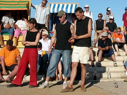 Ruth Seebach / Andreas Globig / Nicolaj Kirchhof (NRW) Deutscher Vizemeister Triplette sind Angelika Thelen / Thomas Thelen / Georgios Dimitriadis (NRW) Den 3. Platz teilen sich Mohamed-Kamel Bourouba / Malte Berger / Kim Rieger (NRW) Christian Hempel / Wolfram Krabiell / Matthias Schmitz (Berlin) Allen einen herzlichen Glückwunsch. Am 18. und 19.06.05 wurden in Lübeck-Travemünde die Deutsche Meisterschaft Triplette ausgetragen. Von den 26 NRW-Teams erreichten 16 Teams den 2. Poule 10 Teams das 1/16-Finale 10 Teams das 1/8-Finale 6 Teams das 1/4-Finale 3 Teams das 1/2-Finale 2 Teams das Finale |