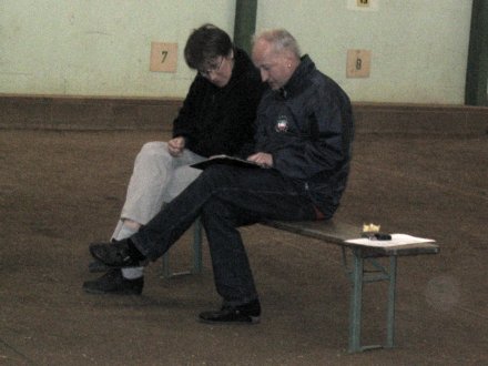 Sitzend: Winni Bohnhoff (Jugendwart Nord) Olaf Wätjen (Jugendwart NiSa) beim Kugelprotokoll