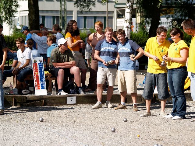Der Verlust schlägt in der 2. Poolrunde weiter zu. Es bleiben lediglich 6 unserer Triplettes für das 16'tel Finale im Rennen. Ab diesem Zeitpunkt bündelt sich die Begeisterung und Unterstützung für unsere Teilnehmer. Man spürt den Willen unsere Leute nach vorne zu peitschen. Kein Spiel mehr, bei dem nicht eine Traube anderer NRW'ler applaudierend an den laufenden Partien Anteil nimmt. Die Stimmung ist prächtig. Laute NRW rufe hallen über den Platz.