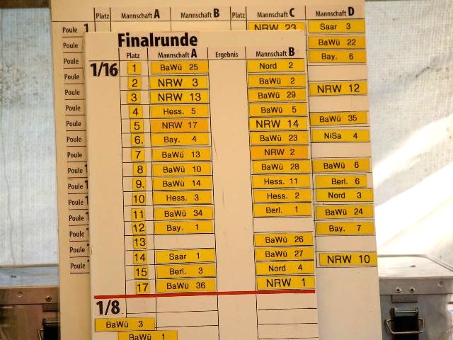 NRW 2 ( Mäder, Streise, Streise ) spielen sich mit Leichtigkeit ins 8'tel Finale. NRW 13 ( Donder, Forthmann, Erricchi ) sowie auch NRW 14 ( Griesberg, Wieling, Minervo ) folgen. Es schloss sich ein Spannung geladenes Spiel von NRW 13 an. Hart umkämpft und trotzdem souverän über die Ziellinie gegangen. Manni, Tommi und Soufi gewannen gegen das BaWü Team von Musa Cebe, die in ihrem Spiel zuvor Kim, Rachid und Kamel mit einem knappen zu : 12 Sieg eliminierten.