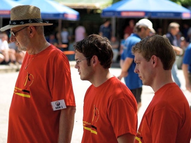 Der Verlust schlägt in der 2. Poolrunde weiter zu. Es bleiben lediglich 6 unserer Triplettes für das 16'tel Finale im Rennen. Ab diesem Zeitpunkt bündelt sich die Begeisterung und Unterstützung für unsere Teilnehmer. Man spürt den Willen unsere Leute nach vorne zu peitschen. Kein Spiel mehr, bei dem nicht eine Traube anderer NRW'ler applaudierend an den laufenden Partien Anteil nimmt. Die Stimmung ist prächtig. Laute NRW rufe hallen über den Platz.
