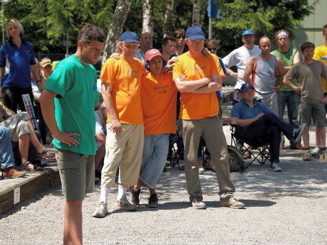 Der Verlust schlägt in der 2. Poolrunde weiter zu. Es bleiben lediglich 6 unserer Triplettes für das 16'tel Finale im Rennen. Ab diesem Zeitpunkt bündelt sich die Begeisterung und Unterstützung für unsere Teilnehmer. Man spürt den Willen unsere Leute nach vorne zu peitschen. Kein Spiel mehr, bei dem nicht eine Traube anderer NRW'ler applaudierend an den laufenden Partien Anteil nimmt. Die Stimmung ist prächtig. Laute NRW rufe hallen über den Platz.