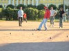 Als wir das Feld, das eigentlich ein großzügig angelegter Park ist, erreichen, sehen wir schon von Ferne die typischen Handbewegungen von Boule spielenden Personen. Hier sind wir offensichtlich richtig.