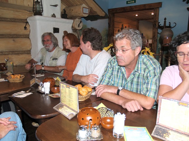 Wir beginnen alle recht vorsichtig mit der Wahl unserer Speisen. Die meisten von uns nehmen zunächst einmal eine Suppe. Wer weiß was man zu essen bekommt, wir sind ja schließlich hier in Russland. Schon nach dem Auftischen der ersten Mahlzeit schnalzen dann aber bald die Zungen. Das sieht ja alles köstlich aus! Und es schmeckt auch so! Zum Essen trinken wir Kwas und russisches Bier, keinen Vodka! Kwas ist eine Art Bierlimonade von dunkler Farbe mit süßlichem zurückhaltendem Geschmack. Man bestellt es in Karaffen von einem halben oder ganzen Liter. Das russische Bier ist von goldgelber kräftiger Farbe und schmeckt würzig und nach mehr! Besonders bei diesen Temperaturen!