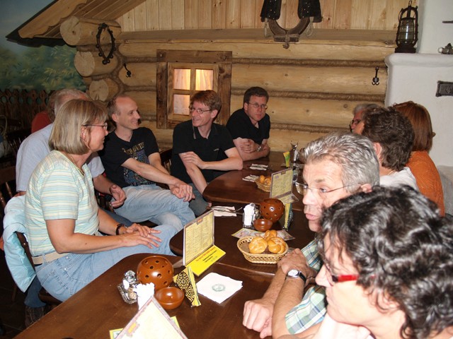 Wenige Minuten später schon stehen wir, gemeinsam mit Sascha, im Eingangsbereich des bereits sehr gut gefüllten Restaurants. Der erste Eindruck vermittelt Wärme und Gemütlichkeit. Das Lokal ist durch sehr viel Holz geprägt. Mittendrin stehen zwei dicke Bäume. Ich nehme mir vor, zu fühlen ob die echt sind, vergesse es jedoch in der Aufregung. Alle Bediensteten sind mit Trachten bekleidet und es fällt sofort auf, dass es mindestens 10 bis 15 Trachten sein müssen, die hier wie die Ameisen kreuz und quer durch das Lokal laufen. An der Wand hängt ein Elchkopf. Riesig. So groß werden Elche? Und dann plötzlich deutsche Stimmen. Durch den Ruf meines eigenen Namens werde ich aus meinem Traum von Kosaken und Kassatschok herausgerissen. Ups, das sind ja Alex (Bauer) und Manfred (Kuhn) unsere süddeutschen Teilnehmer und an ihrem Tisch sitzen noch weitere deutsche Boulespieler aus Germering. Die Begrüßung ist groß. Wie lange seid ihr schon hier? Wo wohnt ihr? Und wie um alles in der Welt kommt ihr gerade auf dieses Restaurant?