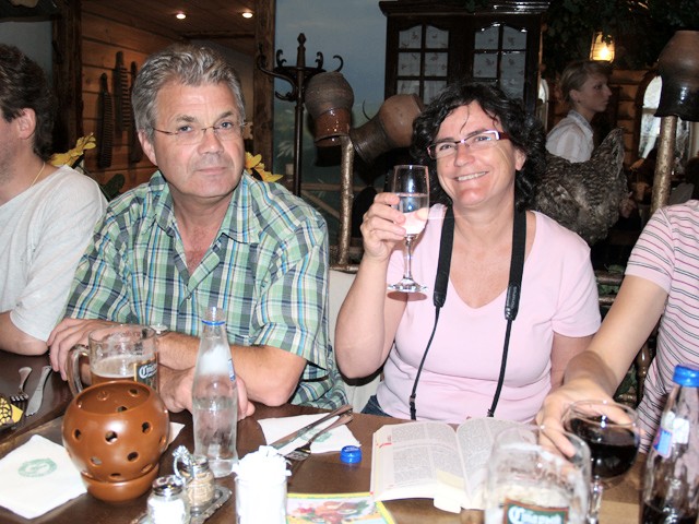 Wenige Minuten später schon stehen wir, gemeinsam mit Sascha, im Eingangsbereich des bereits sehr gut gefüllten Restaurants. Der erste Eindruck vermittelt Wärme und Gemütlichkeit. Das Lokal ist durch sehr viel Holz geprägt. Mittendrin stehen zwei dicke Bäume. Ich nehme mir vor, zu fühlen ob die echt sind, vergesse es jedoch in der Aufregung. Alle Bediensteten sind mit Trachten bekleidet und es fällt sofort auf, dass es mindestens 10 bis 15 Trachten sein müssen, die hier wie die Ameisen kreuz und quer durch das Lokal laufen. An der Wand hängt ein Elchkopf. Riesig. So groß werden Elche? Und dann plötzlich deutsche Stimmen. Durch den Ruf meines eigenen Namens werde ich aus meinem Traum von Kosaken und Kassatschok herausgerissen. Ups, das sind ja Alex (Bauer) und Manfred (Kuhn) unsere süddeutschen Teilnehmer und an ihrem Tisch sitzen noch weitere deutsche Boulespieler aus Germering. Die Begrüßung ist groß. Wie lange seid ihr schon hier? Wo wohnt ihr? Und wie um alles in der Welt kommt ihr gerade auf dieses Restaurant?