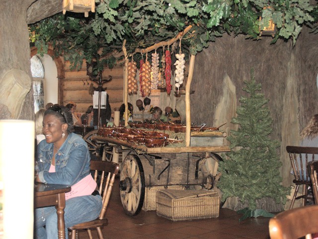 Wenige Minuten später schon stehen wir, gemeinsam mit Sascha, im Eingangsbereich des bereits sehr gut gefüllten Restaurants. Der erste Eindruck vermittelt Wärme und Gemütlichkeit. Das Lokal ist durch sehr viel Holz geprägt. Mittendrin stehen zwei dicke Bäume. Ich nehme mir vor, zu fühlen ob die echt sind, vergesse es jedoch in der Aufregung. Alle Bediensteten sind mit Trachten bekleidet und es fällt sofort auf, dass es mindestens 10 bis 15 Trachten sein müssen, die hier wie die Ameisen kreuz und quer durch das Lokal laufen. An der Wand hängt ein Elchkopf. Riesig. So groß werden Elche? Und dann plötzlich deutsche Stimmen. Durch den Ruf meines eigenen Namens werde ich aus meinem Traum von Kosaken und Kassatschok herausgerissen. Ups, das sind ja Alex (Bauer) und Manfred (Kuhn) unsere süddeutschen Teilnehmer und an ihrem Tisch sitzen noch weitere deutsche Boulespieler aus Germering. Die Begrüßung ist groß. Wie lange seid ihr schon hier? Wo wohnt ihr? Und wie um alles in der Welt kommt ihr gerade auf dieses Restaurant?