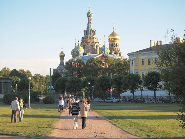 Wir wissen, dass die Nächte um diese Zeit sehr kurz sind und sind deshalb überhaupt nicht darüber erstaunt, dass die Sonne zu diesem Zeitpunkt noch so hoch steht. Wie immer beim ersten Mal erscheint dieser Fußmarsch unendlich zu sein. Sein Ziel eröffnet uns jedoch eine einmalige Perspektive vom Marsfeld hinüber zur Kathedrale "Erlöser auf dem Blute". Buntes Mauerwerk und goldene Kuppeln und Türmchen, beschienen von der tief stehenden Sonne. Einmalig. Und wir spielen in Steinwurfentfernung Boule.