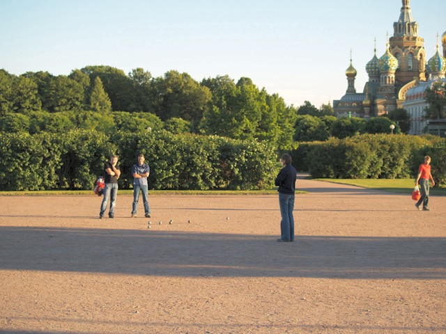 Wir wissen, dass die Nächte um diese Zeit sehr kurz sind und sind deshalb überhaupt nicht darüber erstaunt, dass die Sonne zu diesem Zeitpunkt noch so hoch steht. Wie immer beim ersten Mal erscheint dieser Fußmarsch unendlich zu sein. Sein Ziel eröffnet uns jedoch eine einmalige Perspektive vom Marsfeld hinüber zur Kathedrale "Erlöser auf dem Blute". Buntes Mauerwerk und goldene Kuppeln und Türmchen, beschienen von der tief stehenden Sonne. Einmalig. Und wir spielen in Steinwurfentfernung Boule.