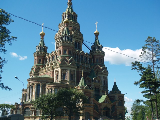 Peterhof. Wir sind da. Ich kann die Eindrücke nicht so schnell verarbeiten, die sich mir da gerade auftun. Alles ist interessant und schön. Links von der Strasse, dem „St. Petersburg prospekt“ steht wieder so eine aufwändig gearbeitete Kirche. Bunt und mit vielen Türmchen. Mit Ecken und Kanten. Etwas was man in Ruhe und mit Bedacht studieren muss.