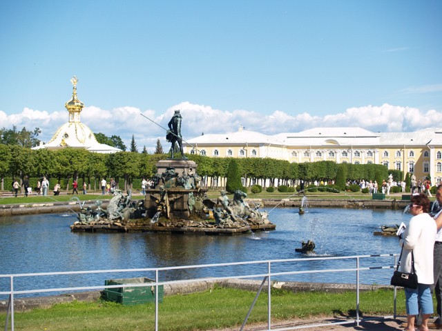 Wir quetschen uns mit der Masse durch das Tor und es tut sich ein märchenhafter Anblick auf. Vor uns liegt, von der Sonne beschienen, das Schloss von Peterhof. Es diente nicht nur Alexander dem Großen als Wohnsitz. Die Parkanlage vor dem Schloss ist sehr großzügig angelegt und mit vielen Brunnen verziert. Sehr eindrucksvoll. Das Schloss selbst erscheint, desto näher man sich ihm nähert immer weißer. Dieser Eindruck wird durch die Sonnenstrahlen extrem begünstigt. Die goldenen (mit Blattgold überzogenen) Türme glänzen majestätisch bis in weite Ferne.