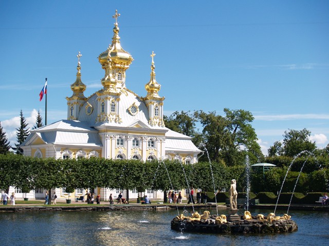 Peterhof. Wir sind da. Ich kann die Eindrücke nicht so schnell verarbeiten, die sich mir da gerade auftun. Alles ist interessant und schön. Links von der Strasse, dem „St. Petersburg prospekt“ steht wieder so eine aufwändig gearbeitete Kirche. Bunt und mit vielen Türmchen. Mit Ecken und Kanten. Etwas was man in Ruhe und mit Bedacht studieren muss.