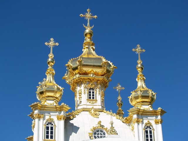 Peterhof. Wir sind da. Ich kann die Eindrücke nicht so schnell verarbeiten, die sich mir da gerade auftun. Alles ist interessant und schön. Links von der Strasse, dem „St. Petersburg prospekt“ steht wieder so eine aufwändig gearbeitete Kirche. Bunt und mit vielen Türmchen. Mit Ecken und Kanten. Etwas was man in Ruhe und mit Bedacht studieren muss.