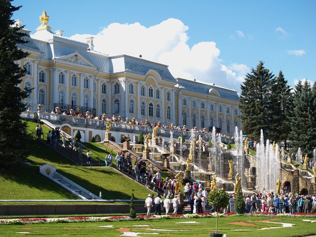 Wir quetschen uns mit der Masse durch das Tor und es tut sich ein märchenhafter Anblick auf. Vor uns liegt, von der Sonne beschienen, das Schloss von Peterhof. Es diente nicht nur Alexander dem Großen als Wohnsitz. Die Parkanlage vor dem Schloss ist sehr großzügig angelegt und mit vielen Brunnen verziert. Sehr eindrucksvoll. Das Schloss selbst erscheint, desto näher man sich ihm nähert immer weißer. Dieser Eindruck wird durch die Sonnenstrahlen extrem begünstigt. Die goldenen (mit Blattgold überzogenen) Türme glänzen majestätisch bis in weite Ferne.