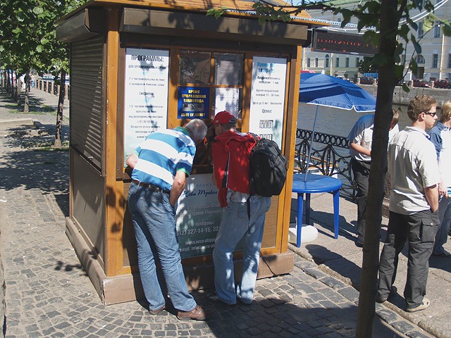 Wir brauchen jedoch dieses Mal gar nicht so weit laufen. Unser Ziel ist die Fontanka. Bei diesem Kanal ist ein Anleger von dem aus man eine Schiffsrundfahrt unternehmen kann. Schon von weitem hört man die Animateure, die ihre Fahrten anpreisen. Es gibt eine ganze Reihe von Unternehmen hier. Auf dem Weg fragen wir uns, wann Alfred, der dritte Mann des zweiten NRW-Triplettes wohl eintreffen mag. Wir wissen nur, dass es wohl heute sein soll.