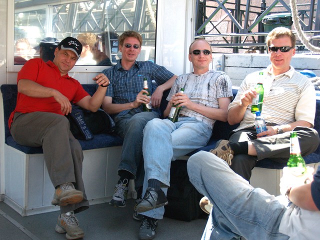 Wir brauchen jedoch dieses Mal gar nicht so weit laufen. Unser Ziel ist die Fontanka. Bei diesem Kanal ist ein Anleger von dem aus man eine Schiffsrundfahrt unternehmen kann. Schon von weitem hört man die Animateure, die ihre Fahrten anpreisen. Es gibt eine ganze Reihe von Unternehmen hier. Auf dem Weg fragen wir uns, wann Alfred, der dritte Mann des zweiten NRW-Triplettes wohl eintreffen mag. Wir wissen nur, dass es wohl heute sein soll.