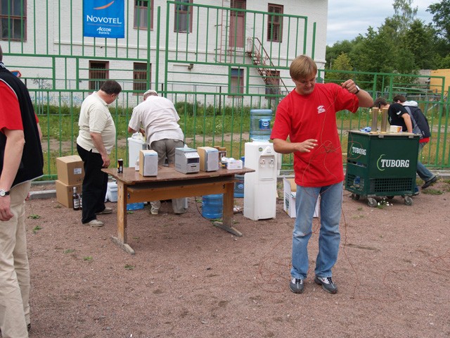 Nach dem Turnier und der Siegerehrung soll nun eigentlich ein Empfang im Foyer einer französischen Hotelkette stattfinden, der aber nun wegen der fortgeschrittenen Stunde und der überstürzten Abreise des russischen Verbandspräsidenten (er muss sein Flugzeug nach Moskau unbedingt noch erreichen) ausfällt. So richtig böse sind wir darum nicht, denn schließlich haben wir allein bei dem ersten Spiel heute fast vier Stunden in der sengenden Hitze gestanden und das schafft einen doch enorm. So beschränkt sich die Feierlichkeit auf eine abschließende Ansprache Ruslan's, des Präsidenten des St. Petersburger Vereines und der feierlichen Überreichung des Wanderpokals durch den Bürgermeister von Peterhof.