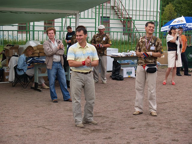In Runde Eins traf Kiss (= Regensburg) auf Kaluga und siegte klar mit 13:4. Buddy und Europa lieferten sich einen mehr als dreieinhalbstündigen Kampf (= längstes Pétanquespiel, das je in Russland gemessen wurde), bevor 'Bertis Buben und Mädel' (bzw. Bernard und Bianca) (= Europa-Team) mit 13:11 knapp die Oberhand behielten. Unsere Regensburger, deren erstes Spiel so schnell gewonnen war, dass man 3 Stunden in der Mittagshitze auf den nächsten Einsatz warten musste, versagten danach, einen wahren Erschöpfungszustand auslebend, gegen ein engagiertes und wirklich gut aufspielendes Moskauer Buddy-Team mit 3:13. Alle Hoffnungen, den Titel vielleicht verteidigen zu können, waren geschwunden, zumal Team Europa auch sein zweites Spiel (gegen Kaluga) nach zähem Ringen 13:10 gewann.