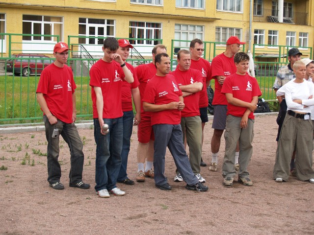 In Runde Eins traf Kiss (= Regensburg) auf Kaluga und siegte klar mit 13:4. Buddy und Europa lieferten sich einen mehr als dreieinhalbstündigen Kampf (= längstes Pétanquespiel, das je in Russland gemessen wurde), bevor 'Bertis Buben und Mädel' (bzw. Bernard und Bianca) (= Europa-Team) mit 13:11 knapp die Oberhand behielten. Unsere Regensburger, deren erstes Spiel so schnell gewonnen war, dass man 3 Stunden in der Mittagshitze auf den nächsten Einsatz warten musste, versagten danach, einen wahren Erschöpfungszustand auslebend, gegen ein engagiertes und wirklich gut aufspielendes Moskauer Buddy-Team mit 3:13. Alle Hoffnungen, den Titel vielleicht verteidigen zu können, waren geschwunden, zumal Team Europa auch sein zweites Spiel (gegen Kaluga) nach zähem Ringen 13:10 gewann.
