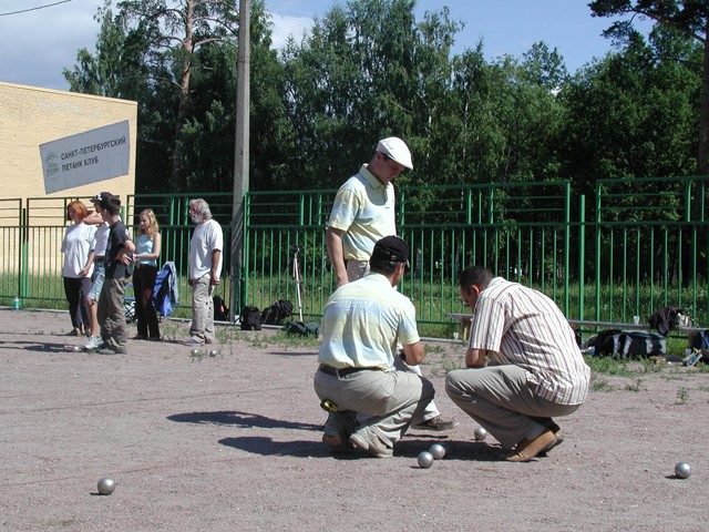 In Runde Eins traf Kiss (= Regensburg) auf Kaluga und siegte klar mit 13:4. Buddy und Europa lieferten sich einen mehr als dreieinhalbstündigen Kampf (= längstes Pétanquespiel, das je in Russland gemessen wurde), bevor 'Bertis Buben und Mädel' (bzw. Bernard und Bianca) (= Europa-Team) mit 13:11 knapp die Oberhand behielten. Unsere Regensburger, deren erstes Spiel so schnell gewonnen war, dass man 3 Stunden in der Mittagshitze auf den nächsten Einsatz warten musste, versagten danach, einen wahren Erschöpfungszustand auslebend, gegen ein engagiertes und wirklich gut aufspielendes Moskauer Buddy-Team mit 3:13. Alle Hoffnungen, den Titel vielleicht verteidigen zu können, waren geschwunden, zumal Team Europa auch sein zweites Spiel (gegen Kaluga) nach zähem Ringen 13:10 gewann.