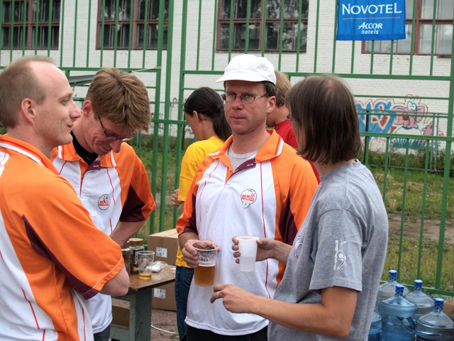Nach dem Turnier und der Siegerehrung soll nun eigentlich ein Empfang im Foyer einer französischen Hotelkette stattfinden, der aber nun wegen der fortgeschrittenen Stunde und der überstürzten Abreise des russischen Verbandspräsidenten (er muss sein Flugzeug nach Moskau unbedingt noch erreichen) ausfällt. So richtig böse sind wir darum nicht, denn schließlich haben wir allein bei dem ersten Spiel heute fast vier Stunden in der sengenden Hitze gestanden und das schafft einen doch enorm. So beschränkt sich die Feierlichkeit auf eine abschließende Ansprache Ruslan's, des Präsidenten des St. Petersburger Vereines und der feierlichen Überreichung des Wanderpokals durch den Bürgermeister von Peterhof.
