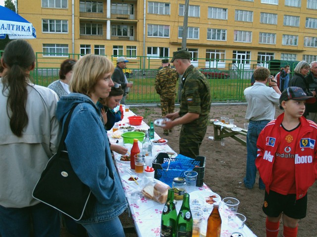Wir wärmen uns ebenfalls auf, werden jedoch durch eintreffende Bekannte, die wir natürlich gerne begrüßen, ständig unterbrochen. Plötzlich wird das Zeichen zur Einschreibung erteilt. 1000 Rubel plus pro Person 300 Rubel für Speis und Trank. Ganz schön viel denkt wohl jeder von uns der in den letzten zwei Tagen schon erzählt bekam wie hoch hier die durchschnittlichen Einkommen sind, ohne zu wissen, was uns noch erwartet! Den ganzen Tag über werden wir mit russischen Spezialitäten versorgt. Vom gefüllten Brötchen über Trockenfisch bis hin zu Erdnüssen und Pistazien war alles in reichhaltiger Auswahl vorhanden. Insgesamt 240 Liter leckersten Bieres werden von den Teilnehmern an den beiden Turniertagen getrunken. Weitere beliebte Getränke sind Tee und Kaffee. Im Anschluss an den ersten Tag des Turniers wird dann vom General höchstpersönlich Schaschlik gegrillt. Wir lassen uns kulinarisch richtig verwöhnen. Als wir des Nachts mit dem Taxi wieder zurück fahren, bin ich so voll gestopft, dass ich mich fast nicht mehr bewegen kann!