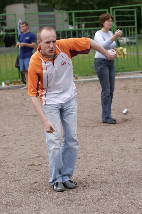 In Runde Eins traf Kiss (= Regensburg) auf Kaluga und siegte klar mit 13:4. Buddy und Europa lieferten sich einen mehr als dreieinhalbstündigen Kampf (= längstes Pétanquespiel, das je in Russland gemessen wurde), bevor 'Bertis Buben und Mädel' (bzw. Bernard und Bianca) (= Europa-Team) mit 13:11 knapp die Oberhand behielten. Unsere Regensburger, deren erstes Spiel so schnell gewonnen war, dass man 3 Stunden in der Mittagshitze auf den nächsten Einsatz warten musste, versagten danach, einen wahren Erschöpfungszustand auslebend, gegen ein engagiertes und wirklich gut aufspielendes Moskauer Buddy-Team mit 3:13. Alle Hoffnungen, den Titel vielleicht verteidigen zu können, waren geschwunden, zumal Team Europa auch sein zweites Spiel (gegen Kaluga) nach zähem Ringen 13:10 gewann.