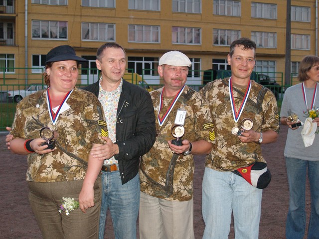 In Runde Eins traf Kiss (= Regensburg) auf Kaluga und siegte klar mit 13:4. Buddy und Europa lieferten sich einen mehr als dreieinhalbstündigen Kampf (= längstes Pétanquespiel, das je in Russland gemessen wurde), bevor 'Bertis Buben und Mädel' (bzw. Bernard und Bianca) (= Europa-Team) mit 13:11 knapp die Oberhand behielten. Unsere Regensburger, deren erstes Spiel so schnell gewonnen war, dass man 3 Stunden in der Mittagshitze auf den nächsten Einsatz warten musste, versagten danach, einen wahren Erschöpfungszustand auslebend, gegen ein engagiertes und wirklich gut aufspielendes Moskauer Buddy-Team mit 3:13. Alle Hoffnungen, den Titel vielleicht verteidigen zu können, waren geschwunden, zumal Team Europa auch sein zweites Spiel (gegen Kaluga) nach zähem Ringen 13:10 gewann.
