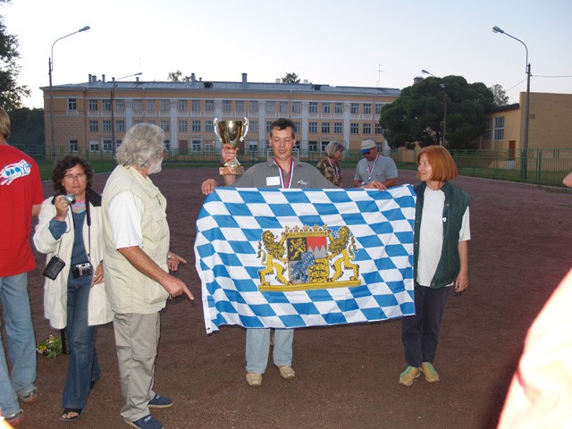 Nach dem Turnier und der Siegerehrung soll nun eigentlich ein Empfang im Foyer einer französischen Hotelkette stattfinden, der aber nun wegen der fortgeschrittenen Stunde und der überstürzten Abreise des russischen Verbandspräsidenten (er muss sein Flugzeug nach Moskau unbedingt noch erreichen) ausfällt. So richtig böse sind wir darum nicht, denn schließlich haben wir allein bei dem ersten Spiel heute fast vier Stunden in der sengenden Hitze gestanden und das schafft einen doch enorm. So beschränkt sich die Feierlichkeit auf eine abschließende Ansprache Ruslan's, des Präsidenten des St. Petersburger Vereines und der feierlichen Überreichung des Wanderpokals durch den Bürgermeister von Peterhof.