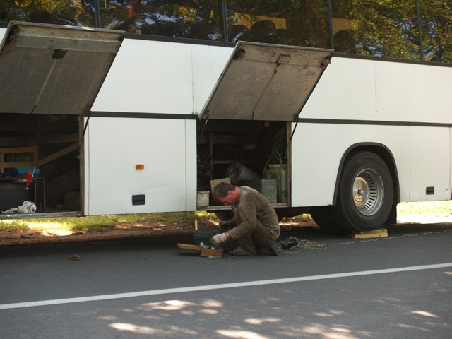 Irgendwann ist meine Kauflust dann auch erloschen und ich ergebe mich meinem Schicksal diesen heiligen Ort des Handels verlassen zu müssen. Wir verlassen ihn quasi durch den Hinterausgang. Eine Baumallee, an der zumindest für die nächsten hunderte von Metern keine Boulehalle zu erspähen ist. Das einzige was mir auffällt ist ein Gulliloch, dass so tief ist, dass darin ein Kleinkind verschwinden würde. Wer hier ohne Beleuchtung Fahrrad fährt, sollte einen siebten Sinn besitzen, so eine Art Radar wie bei den Fledermäusen. Wir laufen und laufen. Vorbei an einer Kaserne und an einem Reisebus, dessen Fahrer, in der Zeit dass seine "Bertis" den Markt leer kaufen, sich mit den nötigsten Reparaturen am Bus befasst. Obwohl dieser Bus gar nicht so alt aussieht, hat er dort, wo üblicherweise die Koffer untergebracht werden eine mobile Werkstatt installiert. Ich sehe eine Drehbank, etliches Werkzeug und einen gerade schweißenden Fahrer.