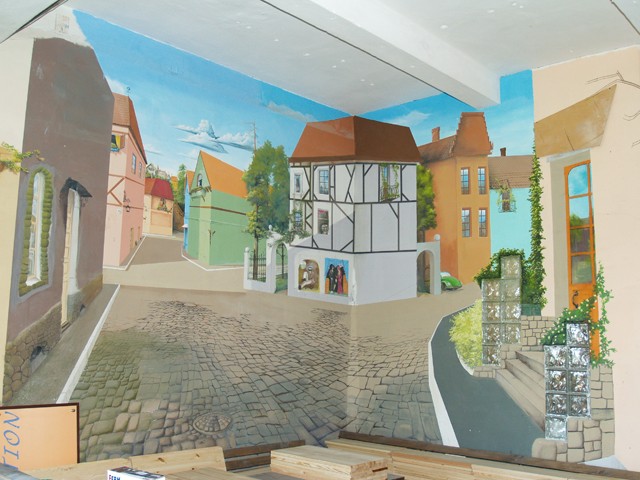 Auf der anderen Seite des Raumes befindet sich der Ausgang zum Hof. Die Gebäude ringsum sehen alt und unbenutzt aus. Rechts von uns befindet sich ein Teich mit einem kleinen Wehr. Wir überqueren eine kleine Brücke und laufen ca. 400 m einen Abhang hinab. Hinter den hohen wildwachsenden Bäumen verbergen sich weitere Gebäude. Am Fuße des Hügels angelangt betreten wir über eine steinerne Treppe eines der Gebäude, die vermutlich tatsächlich alte Fabrikhallen gewesen sind. Es ist dunkel in diesem Gang. Grau in grau. Die Tür links scheint verbarrikadiert. Warum? Lesen können wir hier nichts. Doch a la wir weiterlaufen, sehen wir an den Wänden Wandmalereien. So müssen sich die Entdecker der alten Höhlen in Südfrankreich gefühlt haben. Sieh mal, der hat Boulekugeln in der Hand! Unser weiterer Weg, mal links, mal rechts aber ständig nach oben ist mit zunehmend mehr Malereien verziert. Wir sind also da! In der Boulehalle. Oben! In der mindestens zweiten Etage.