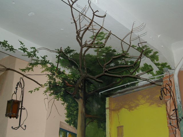 Auf der anderen Seite des Raumes befindet sich der Ausgang zum Hof. Die Gebäude ringsum sehen alt und unbenutzt aus. Rechts von uns befindet sich ein Teich mit einem kleinen Wehr. Wir überqueren eine kleine Brücke und laufen ca. 400 m einen Abhang hinab. Hinter den hohen wildwachsenden Bäumen verbergen sich weitere Gebäude. Am Fuße des Hügels angelangt betreten wir über eine steinerne Treppe eines der Gebäude, die vermutlich tatsächlich alte Fabrikhallen gewesen sind. Es ist dunkel in diesem Gang. Grau in grau. Die Tür links scheint verbarrikadiert. Warum? Lesen können wir hier nichts. Doch a la wir weiterlaufen, sehen wir an den Wänden Wandmalereien. So müssen sich die Entdecker der alten Höhlen in Südfrankreich gefühlt haben. Sieh mal, der hat Boulekugeln in der Hand! Unser weiterer Weg, mal links, mal rechts aber ständig nach oben ist mit zunehmend mehr Malereien verziert. Wir sind also da! In der Boulehalle. Oben! In der mindestens zweiten Etage.