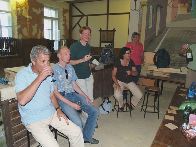 Noch einige Schritte und wir erstarren vor Erstaunen. So etwas haben wir alle noch nicht gesehen. 6 Boulebahnen, mit ein wenig gutem Willen sogar 8 in einem großen vielleicht gute 4 Meter hohen Raum. Rundum die Bahnen liebevoll mit Holz verkleidet, wobei peinlichst genau darauf geachtet wurde, dass sich die Muster in der Verkleidung nicht wiederholen. Und dort eine einladende Theke, daneben die Sanitäranlagen mit verschiedenen Toiletten, Duschen und einer Saunaanlage. Alles vom Feinsten und mit vielen lustigen Attributen, wie einem in den Boden eingelassenen Brausekopf mit Schlauch. Das absolute Highlight ist jedoch die Sitzecke. Die Wände von sicherlich über 30 qm Größe sind mit französischen Straßenszenen plastisch, dreidimensional gestaltet. Mit Liebe zum Detail ist eine Treppe aus der Wand hervorstechend, ein Kellerloch darin eingelassen. Insgesamt eine Meisterleistung, deren einzelne Details zu beschreiben allein zwei Seiten in Anspruch nehmen würde. Wir sind uns alle einig. Ab sofort werden Boulehallen klassifiziert und diese hier kommt in die allerhöchste Wertung. Sie erreicht 5 Boulekugeln (gleichzusetzen mit 5 Michelin Sternen).