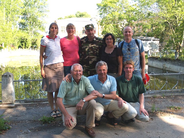 Trotz des sehr informativen Gespräches brennen wir darauf nach Oranienbaum zu kommen. Ruslan lässt uns allerdings nicht gehen, ohne uns vorher noch ein Geschenk gemacht zu haben. Alle Teilnehmer bekommen von ihm ein 13x18 cm gerahmtes Bild mit einem der hiesigen Bauwerke darauf abgebildet. Als weitere Überraschung entfaltet er eine Flagge von Peterhof, die er mir für unseren Verband schenkt. Da steigen mir tatsächlich, hoffentlich von den anderen unbemerkt, die Tränen in die Augen. Noch bevor wir das Gelände verlassen, kommt uns der General mit seinem Passat Kombi und dem Pétanque Aufkleber entgegen. Schnell noch einige Gruppenfotos mit General.