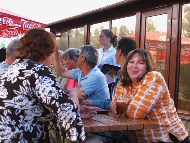 Am Ausgang des Parkgeländes befindet sich ein Restaurant, direkt gegenüber, weit weg vom Markt. Hier kehren wir ein. Gehen wir rein oder bleiben wir draußen? Die Sonne scheint, es ist warm, wir bleiben draußen. Die Kellnerin kommt reicht uns die Karten und verduftet wieder. Als sie wiederkommt um die Getränkebestellung entgegen zu nehmen frage ich sie in Englisch ob sie Englisch spricht. Nein leider nicht, sie spricht nur Deutsch. Ach so. Deutsch? Na, das vereinfacht die Sache ja ungemein. So können wir doch viel schneller bestellen. Ich bestelle nicht, sondern lasse mir wieder von meinen russischen Freunden irgend eine Spezialität aus der Karte aussuchen. Hauptsache landestypisch. Ich werde mit dieser Vorgehensweise auch die ganz Zeit über, obwohl immer andere für mich bestellen, nie enttäuscht. Nach einer Weile kommen weitere Freunde. Katie und Sasha (der Große), Jane und Ruslan und auch Anne und Andreij, der General.