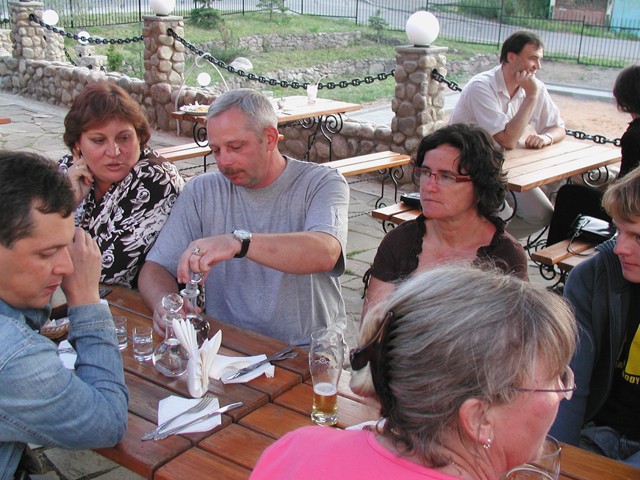 Am Ausgang des Parkgeländes befindet sich ein Restaurant, direkt gegenüber, weit weg vom Markt. Hier kehren wir ein. Gehen wir rein oder bleiben wir draußen? Die Sonne scheint, es ist warm, wir bleiben draußen. Die Kellnerin kommt reicht uns die Karten und verduftet wieder. Als sie wiederkommt um die Getränkebestellung entgegen zu nehmen frage ich sie in Englisch ob sie Englisch spricht. Nein leider nicht, sie spricht nur Deutsch. Ach so. Deutsch? Na, das vereinfacht die Sache ja ungemein. So können wir doch viel schneller bestellen. Ich bestelle nicht, sondern lasse mir wieder von meinen russischen Freunden irgend eine Spezialität aus der Karte aussuchen. Hauptsache landestypisch. Ich werde mit dieser Vorgehensweise auch die ganz Zeit über, obwohl immer andere für mich bestellen, nie enttäuscht. Nach einer Weile kommen weitere Freunde. Katie und Sasha (der Große), Jane und Ruslan und auch Anne und Andreij, der General.