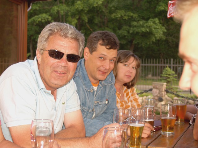 Am Ausgang des Parkgeländes befindet sich ein Restaurant, direkt gegenüber, weit weg vom Markt. Hier kehren wir ein. Gehen wir rein oder bleiben wir draußen? Die Sonne scheint, es ist warm, wir bleiben draußen. Die Kellnerin kommt reicht uns die Karten und verduftet wieder. Als sie wiederkommt um die Getränkebestellung entgegen zu nehmen frage ich sie in Englisch ob sie Englisch spricht. Nein leider nicht, sie spricht nur Deutsch. Ach so. Deutsch? Na, das vereinfacht die Sache ja ungemein. So können wir doch viel schneller bestellen. Ich bestelle nicht, sondern lasse mir wieder von meinen russischen Freunden irgend eine Spezialität aus der Karte aussuchen. Hauptsache landestypisch. Ich werde mit dieser Vorgehensweise auch die ganz Zeit über, obwohl immer andere für mich bestellen, nie enttäuscht. Nach einer Weile kommen weitere Freunde. Katie und Sasha (der Große), Jane und Ruslan und auch Anne und Andreij, der General.