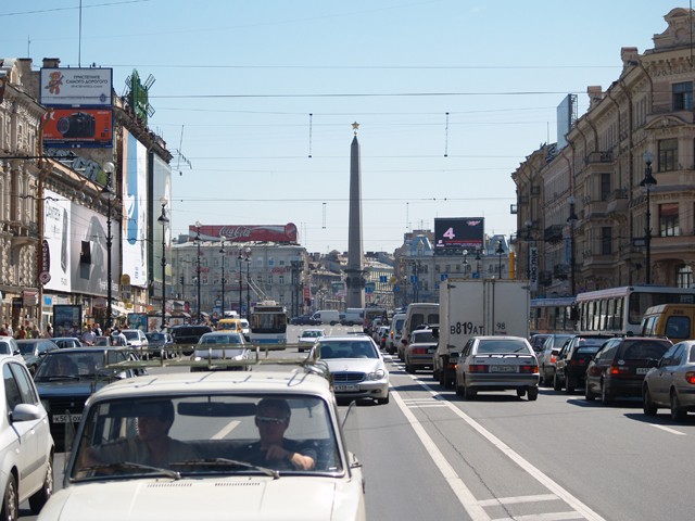Vom Fotostudio ausgehend, laufen wir querfeldein durch kleine Strassen und Hinterhöfe St. Petersburgs und saugen die Eindrücke in uns auf. Immer wieder stoßen wir auf Besonderheiten. Auf diese Art und Weise nähern wir uns immer mehr dem eigentlichen Zentrum. Unsere Neugierde treibt uns in eine „Hofeinfahrt“ die sich als Zugang zu einem öffentlichen Markt herausstellt. Hier sind die Häuser alle höchstens anderthalb geschossig. Jedes Haus beherbergt ein kleines Geschäft in dem vornehmlich Textilien aber auch alle anderen Notwendigkeiten des täglichen Lebens verhandelt werden. Unterbrochen werden die Häuserzeilen durch größere Plätze auf denen sich Marktstände wie an einer Perlenkette aufreihen. Die schmalen Wege dazwischen erlauben höchsten drei Personen nebeneinander zu laufen. In den Ständen von maximal 2 x 2 Metern Größe probieren Frauen sowohl Perücken als auch Kleidungsstücke bis hin zur Unterwäsche an. Es versteht sich von allein, dass es auf diesem engen Raum keine Umkleidekabinen gibt. Es scheint aber auch niemanden so richtig zu stören. Ich kaufe natürlich auch etwas. Dieses Mal ist es das Trikot von Zinedine Zidane, meinem französischen Lieblingsspieler. Es kostet nicht sehr viel. Nun muss ich ein paar Kilo abnehmen damit ich es auch einmal tragen kann. Bianca nöhlt wie immer wenn ich gemütlich einkaufen möchte ein wenig rum: „Wofür brauchst du das?“ und zerrt mich langsam aber zielstrebig aus der Gefahrenzone heraus.