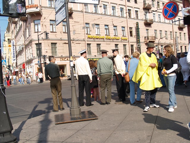 Vom Fotostudio ausgehend, laufen wir querfeldein durch kleine Strassen und Hinterhöfe St. Petersburgs und saugen die Eindrücke in uns auf. Immer wieder stoßen wir auf Besonderheiten. Auf diese Art und Weise nähern wir uns immer mehr dem eigentlichen Zentrum. Unsere Neugierde treibt uns in eine „Hofeinfahrt“ die sich als Zugang zu einem öffentlichen Markt herausstellt. Hier sind die Häuser alle höchstens anderthalb geschossig. Jedes Haus beherbergt ein kleines Geschäft in dem vornehmlich Textilien aber auch alle anderen Notwendigkeiten des täglichen Lebens verhandelt werden. Unterbrochen werden die Häuserzeilen durch größere Plätze auf denen sich Marktstände wie an einer Perlenkette aufreihen. Die schmalen Wege dazwischen erlauben höchsten drei Personen nebeneinander zu laufen. In den Ständen von maximal 2 x 2 Metern Größe probieren Frauen sowohl Perücken als auch Kleidungsstücke bis hin zur Unterwäsche an. Es versteht sich von allein, dass es auf diesem engen Raum keine Umkleidekabinen gibt. Es scheint aber auch niemanden so richtig zu stören. Ich kaufe natürlich auch etwas. Dieses Mal ist es das Trikot von Zinedine Zidane, meinem französischen Lieblingsspieler. Es kostet nicht sehr viel. Nun muss ich ein paar Kilo abnehmen damit ich es auch einmal tragen kann. Bianca nöhlt wie immer wenn ich gemütlich einkaufen möchte ein wenig rum: „Wofür brauchst du das?“ und zerrt mich langsam aber zielstrebig aus der Gefahrenzone heraus.