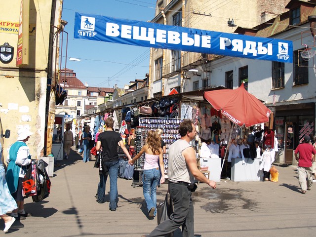 Vom Fotostudio ausgehend, laufen wir querfeldein durch kleine Strassen und Hinterhöfe St. Petersburgs und saugen die Eindrücke in uns auf. Immer wieder stoßen wir auf Besonderheiten. Auf diese Art und Weise nähern wir uns immer mehr dem eigentlichen Zentrum. Unsere Neugierde treibt uns in eine „Hofeinfahrt“ die sich als Zugang zu einem öffentlichen Markt herausstellt. Hier sind die Häuser alle höchstens anderthalb geschossig. Jedes Haus beherbergt ein kleines Geschäft in dem vornehmlich Textilien aber auch alle anderen Notwendigkeiten des täglichen Lebens verhandelt werden. Unterbrochen werden die Häuserzeilen durch größere Plätze auf denen sich Marktstände wie an einer Perlenkette aufreihen. Die schmalen Wege dazwischen erlauben höchsten drei Personen nebeneinander zu laufen. In den Ständen von maximal 2 x 2 Metern Größe probieren Frauen sowohl Perücken als auch Kleidungsstücke bis hin zur Unterwäsche an. Es versteht sich von allein, dass es auf diesem engen Raum keine Umkleidekabinen gibt. Es scheint aber auch niemanden so richtig zu stören. Ich kaufe natürlich auch etwas. Dieses Mal ist es das Trikot von Zinedine Zidane, meinem französischen Lieblingsspieler. Es kostet nicht sehr viel. Nun muss ich ein paar Kilo abnehmen damit ich es auch einmal tragen kann. Bianca nöhlt wie immer wenn ich gemütlich einkaufen möchte ein wenig rum: „Wofür brauchst du das?“ und zerrt mich langsam aber zielstrebig aus der Gefahrenzone heraus.