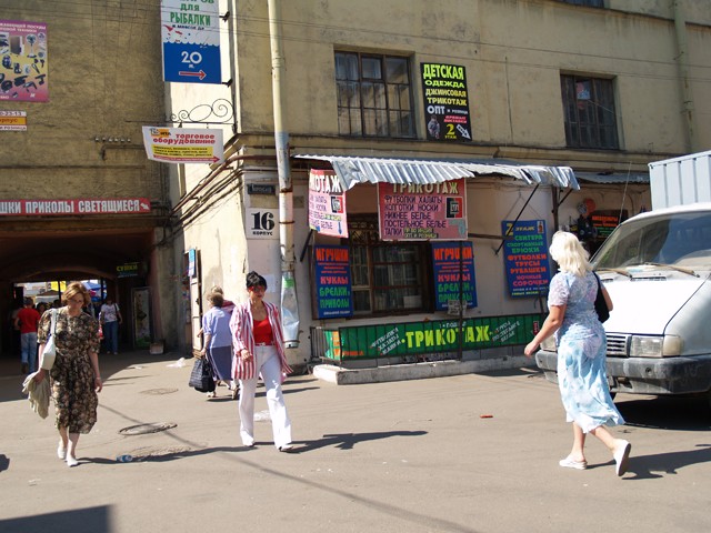 Vom Fotostudio ausgehend, laufen wir querfeldein durch kleine Strassen und Hinterhöfe St. Petersburgs und saugen die Eindrücke in uns auf. Immer wieder stoßen wir auf Besonderheiten. Auf diese Art und Weise nähern wir uns immer mehr dem eigentlichen Zentrum. Unsere Neugierde treibt uns in eine „Hofeinfahrt“ die sich als Zugang zu einem öffentlichen Markt herausstellt. Hier sind die Häuser alle höchstens anderthalb geschossig. Jedes Haus beherbergt ein kleines Geschäft in dem vornehmlich Textilien aber auch alle anderen Notwendigkeiten des täglichen Lebens verhandelt werden. Unterbrochen werden die Häuserzeilen durch größere Plätze auf denen sich Marktstände wie an einer Perlenkette aufreihen. Die schmalen Wege dazwischen erlauben höchsten drei Personen nebeneinander zu laufen. In den Ständen von maximal 2 x 2 Metern Größe probieren Frauen sowohl Perücken als auch Kleidungsstücke bis hin zur Unterwäsche an. Es versteht sich von allein, dass es auf diesem engen Raum keine Umkleidekabinen gibt. Es scheint aber auch niemanden so richtig zu stören. Ich kaufe natürlich auch etwas. Dieses Mal ist es das Trikot von Zinedine Zidane, meinem französischen Lieblingsspieler. Es kostet nicht sehr viel. Nun muss ich ein paar Kilo abnehmen damit ich es auch einmal tragen kann. Bianca nöhlt wie immer wenn ich gemütlich einkaufen möchte ein wenig rum: „Wofür brauchst du das?“ und zerrt mich langsam aber zielstrebig aus der Gefahrenzone heraus.