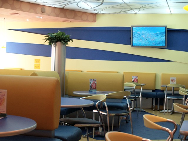 An der Kirche St. Petri laufen wir nun über den Nevsky in Richtung Bolshaja Newa. Hunger beschleicht uns. Laufen macht hungrig. Wir suchen nach einem Schnellrestaurant. Erstens wollen wir nicht viel essen und zweitens nicht so viel Zeit verbummeln. Wir finden tatsächlich einen „russischen MacDonalds“. Hier gibt es in sehr großer Auswahl alles was die russische Küche so bietet. Wir stehen ratlos vor einer langen Theke in der bereits vorbereitete Salate und Desserts aufgereiht stehen. Alles sieht verführerisch aus. In vielen Fällen können wir nur ahnen was es ist. Hinter der Theke hängt eine riesige bebilderte Tafel, die die gesamte Speisekarte darstellt. Allerdings alles in kyrillischen Buchstaben. „Wir können ja nach Bildern bestellen“, sage ich zu meiner Hulda. Das sind vermutlich Reizworte für eine der fixen Damen hinter der Theke. Sie winkt jemandem zu und plötzlich sagt eine junge freundliche weibliche Stimme neben mir: „Kann ich Ihnen helfen?“ Ich bemühe mich meinen Mund wieder zu schließen und sage immer noch überrascht: „Ja! Wir möchten gerne etwas essen!“ Von nun an, geht alles wie von selbst. Wir setzen uns mit unserem Tablett, den Getränken und dem Salat und auch der Nummerntafel an einen der modernen Tische und schauen auf dem großen Plasma Fernseher MTV auf russisch. Es dauert nicht lange, dann bringt uns unsere freundliche Bedienung unsere Essen.