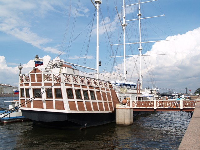 Noch einmal gute 3 km zurück zum Fluss. Dort angekommen, es ist natürlich noch nicht dunkel, setzen wir uns auf diese alte Fregatte, die dort vor Anker liegt und als Restaurantschiff dient. Wir überbrücken die Wartezeit mit einem Baltika und einigen Tassen Kaffee um das Schauspiel gleich überhaupt noch wach erleben zu können. Kurz nach halb drei morgens ist es dann soweit. Unter festlicher Beleuchtung öffnen sich die Brücken und die Schiffe, die den ganzen Tag vor den Toren St. Petersburg vor Anker lagen, können nun passieren.