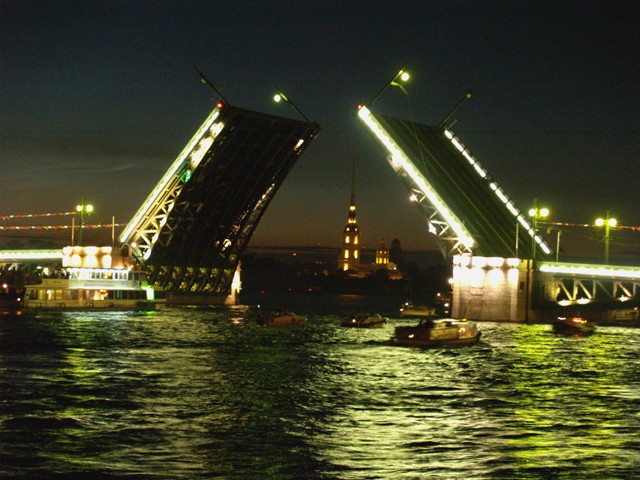 Noch einmal gute 3 km zurück zum Fluss. Dort angekommen, es ist natürlich noch nicht dunkel, setzen wir uns auf diese alte Fregatte, die dort vor Anker liegt und als Restaurantschiff dient. Wir überbrücken die Wartezeit mit einem Baltika und einigen Tassen Kaffee um das Schauspiel gleich überhaupt noch wach erleben zu können. Kurz nach halb drei morgens ist es dann soweit. Unter festlicher Beleuchtung öffnen sich die Brücken und die Schiffe, die den ganzen Tag vor den Toren St. Petersburg vor Anker lagen, können nun passieren.