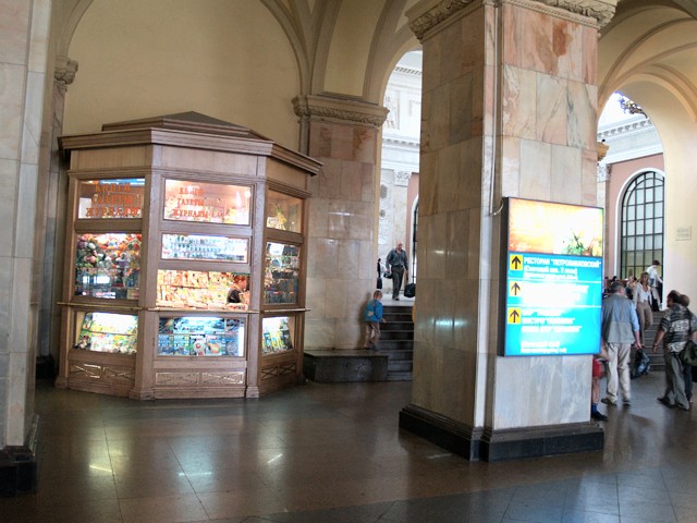 Wir wussten nicht, dass sich an diesen Komplex, auf der anderen Seite das größte Kaufhaus St. Petersburgs anschloss, sonst wären wir natürlich dort auch noch hinein gegangen! Auf eine Gesamtlänge von 4,5 Kilometern gibt es in diesem trapezförmigen Gebäude ein Geschäft neben dem anderen. Kaufhäuser, so wie in unseren Breitengraden gibt es in der Form hier wohl noch nicht. Allerdings übt diese Anreihung von Einzelhandelsgeschäften einen viel größeren Reiz auf die Käufer aus als bei Real.