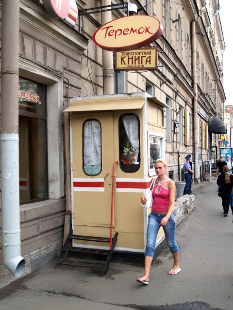 Vom Fotostudio ausgehend, laufen wir querfeldein durch kleine Strassen und Hinterhöfe St. Petersburgs und saugen die Eindrücke in uns auf. Immer wieder stoßen wir auf Besonderheiten. Auf diese Art und Weise nähern wir uns immer mehr dem eigentlichen Zentrum. Unsere Neugierde treibt uns in eine „Hofeinfahrt“ die sich als Zugang zu einem öffentlichen Markt herausstellt. Hier sind die Häuser alle höchstens anderthalb geschossig. Jedes Haus beherbergt ein kleines Geschäft in dem vornehmlich Textilien aber auch alle anderen Notwendigkeiten des täglichen Lebens verhandelt werden. Unterbrochen werden die Häuserzeilen durch größere Plätze auf denen sich Marktstände wie an einer Perlenkette aufreihen. Die schmalen Wege dazwischen erlauben höchsten drei Personen nebeneinander zu laufen. In den Ständen von maximal 2 x 2 Metern Größe probieren Frauen sowohl Perücken als auch Kleidungsstücke bis hin zur Unterwäsche an. Es versteht sich von allein, dass es auf diesem engen Raum keine Umkleidekabinen gibt. Es scheint aber auch niemanden so richtig zu stören. Ich kaufe natürlich auch etwas. Dieses Mal ist es das Trikot von Zinedine Zidane, meinem französischen Lieblingsspieler. Es kostet nicht sehr viel. Nun muss ich ein paar Kilo abnehmen damit ich es auch einmal tragen kann. Bianca nöhlt wie immer wenn ich gemütlich einkaufen möchte ein wenig rum: „Wofür brauchst du das?“ und zerrt mich langsam aber zielstrebig aus der Gefahrenzone heraus.
